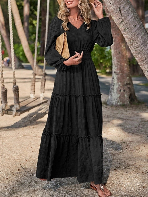 Long Sleeve V-Neck Nipped Waist Maxi Dress | Black