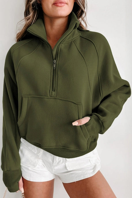 Olive Green Zip-Up Stand Collar Ribbed Thumbhole Sleeve Sweatshirt